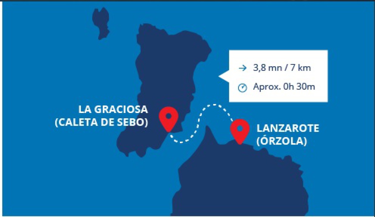 Die Boote fahren zehnmal täglich von Órzola, Lanzarote ab und segeln nach Caleta de Sebo, La Graciosa. Die Reise dauert ungefähr 30 Minuten und Sie können an Deck oder im Inneren des Bootes reisen,